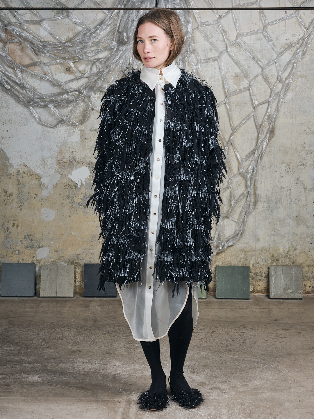 Einzigartiger Fransen-Mantel von Dries van Noten mit Woll- u. Lack-Stroh Fransen.